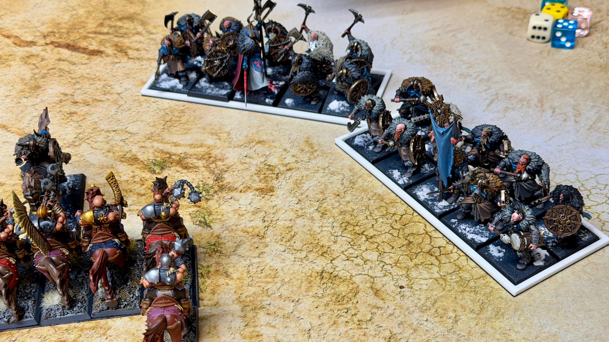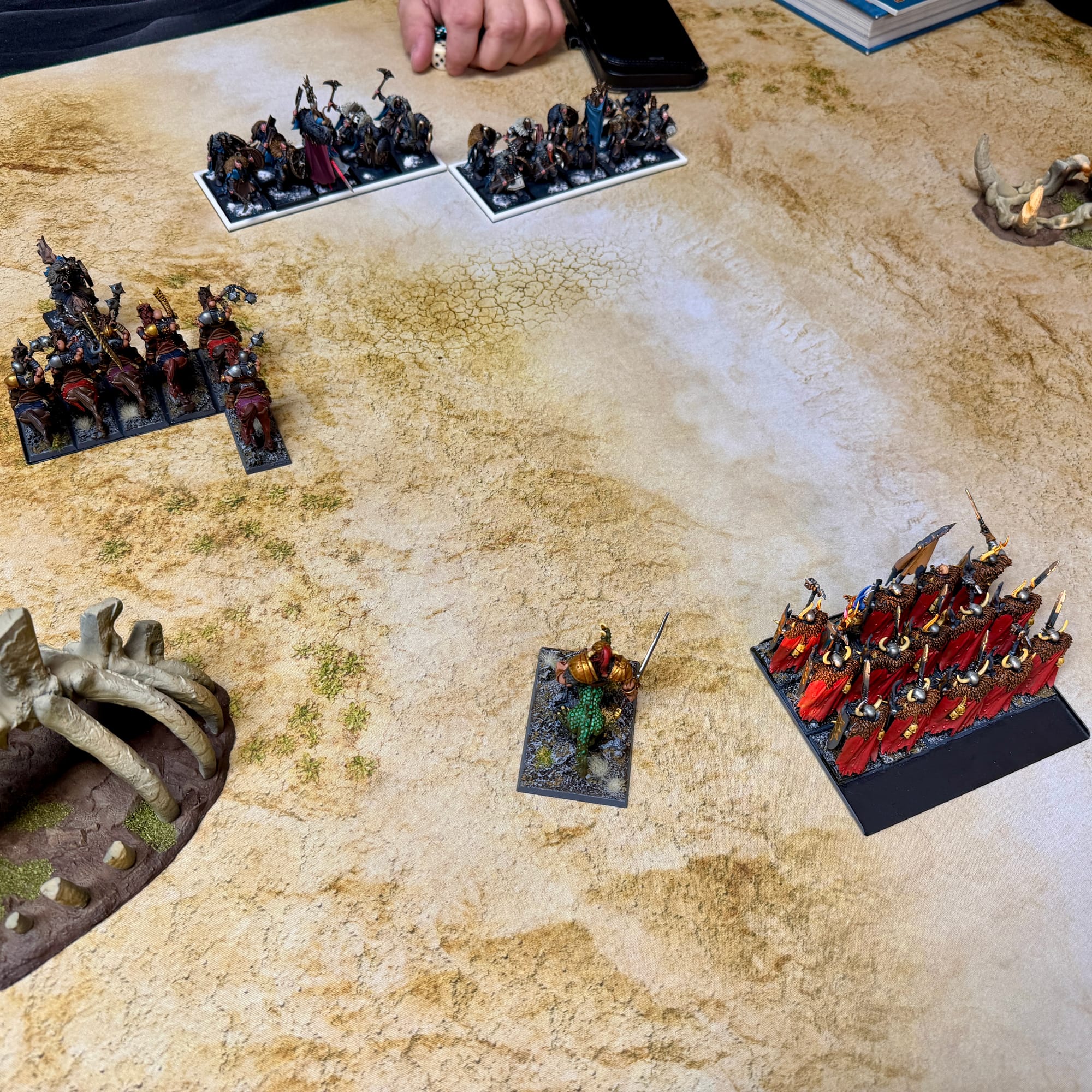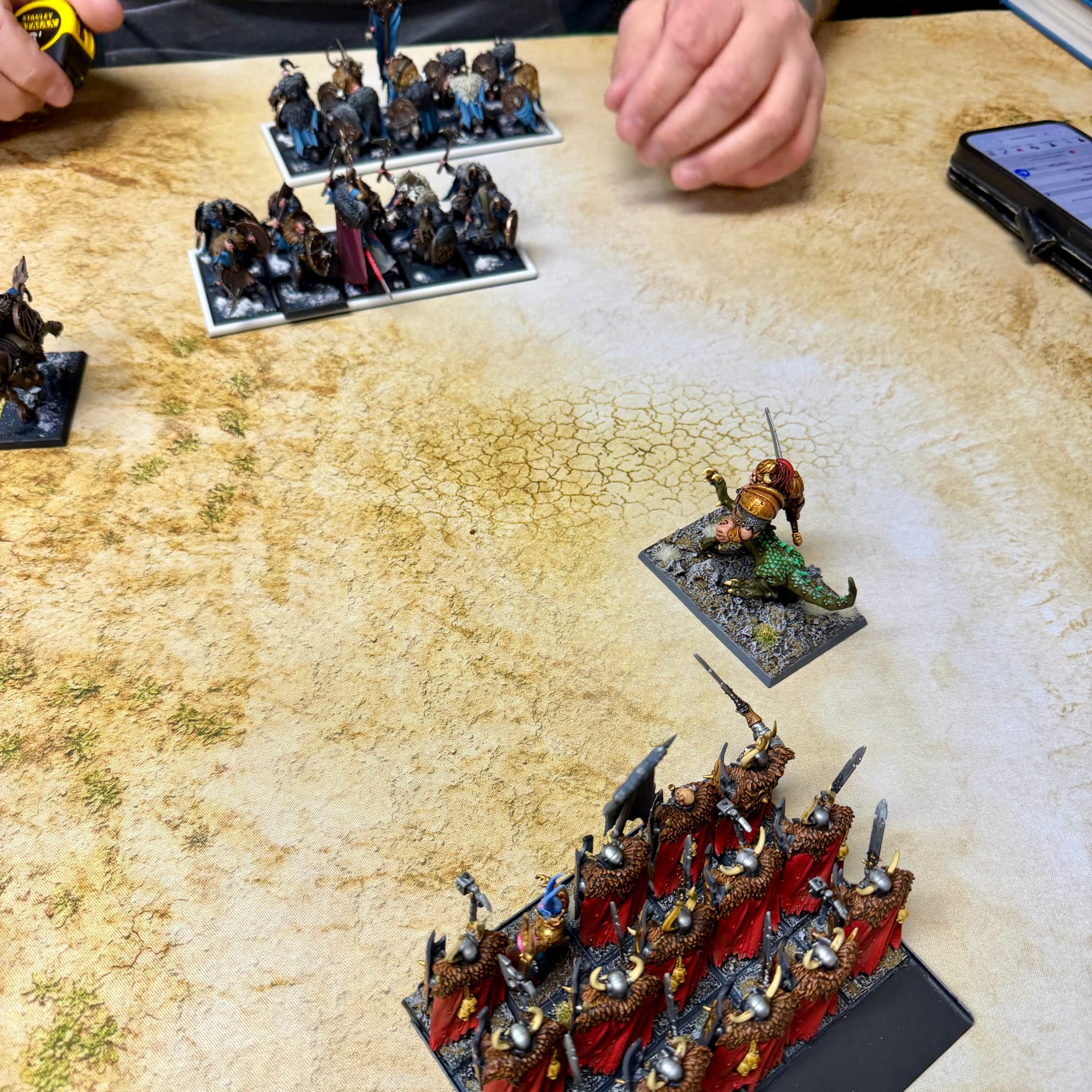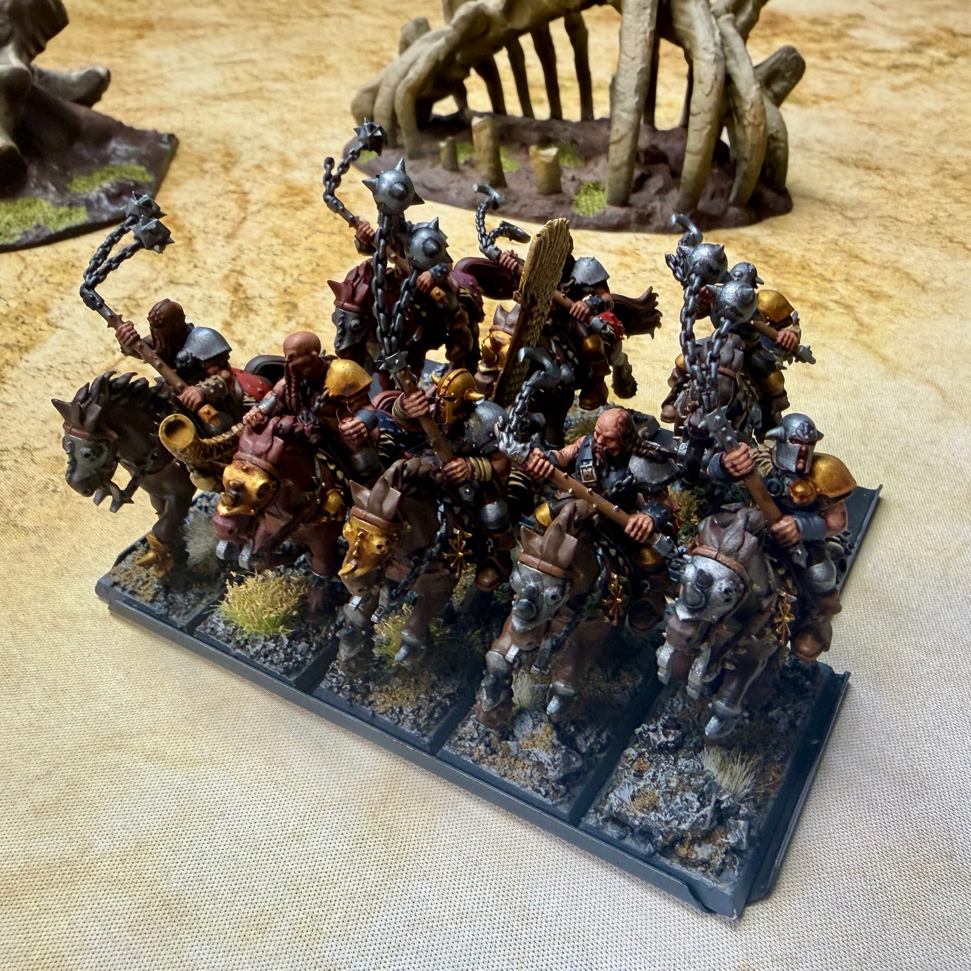 As the band crossed through the mountain range, they found themselves on a flat and dusty plateau in the heart of the mountains. Facing them was a rival Chaos warband, led by a powerful sorcerer lord and composed of fearsome marauder veterans. The winds of magic stirred in anticipation of blood to be spilled, and Zubaz's marauder horsemen charged forth, crashing into the rival horsemen with their flails.