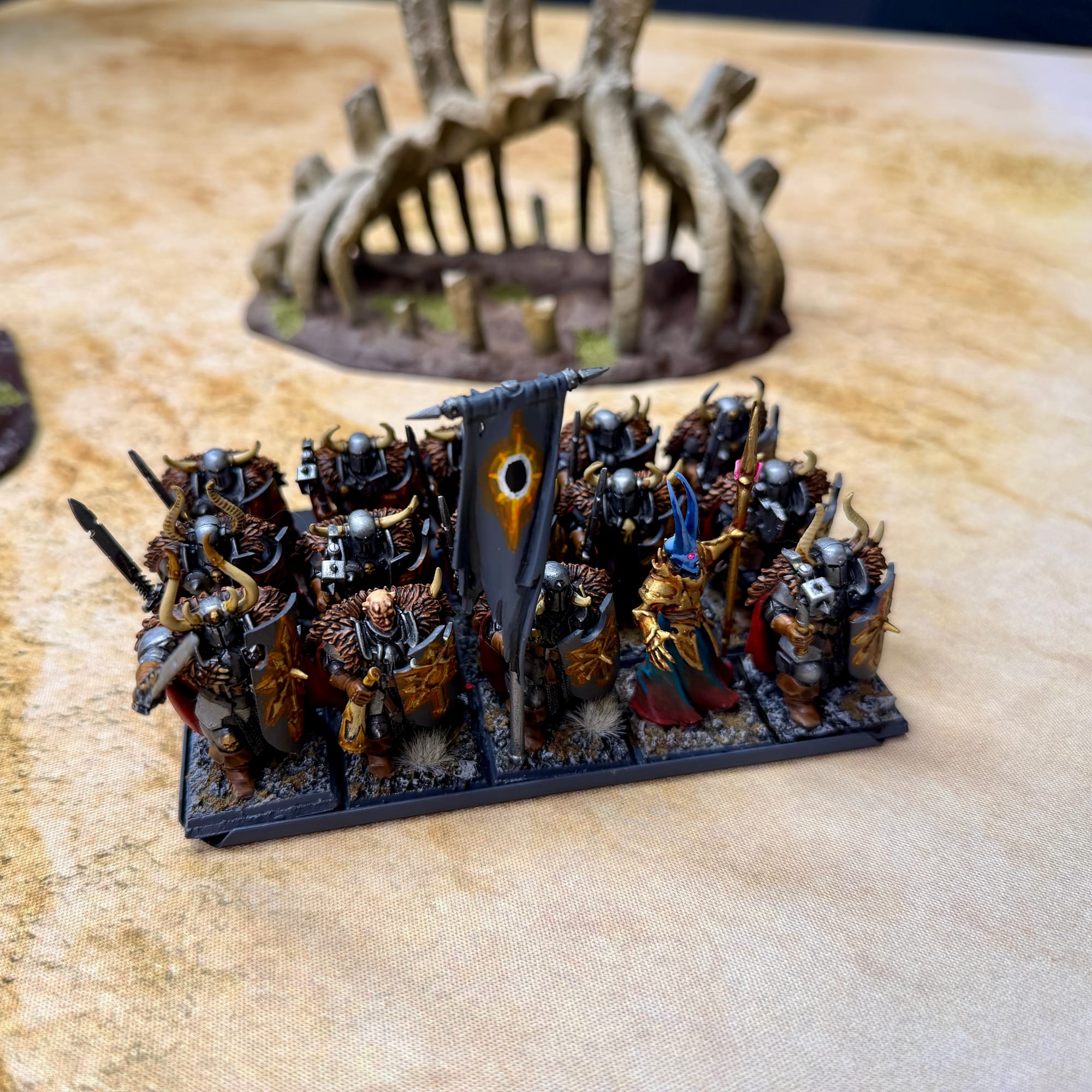 As the horsemen serried forth, Zubaz spread word of his prophecy throughout the Dark Lands, hoping to gather more allies. His call was heeded by a band of Chaos warriors- the Brotherhood of the Black Sun. A small, hardbitten group of veterans of a campaign deep into the Chaos Wastes, the Brotherhood was a collection of survivors that had been led by a champion that had been found wanting by the dark gods. Struck by the vision of a Western sun, they decided to follow the prophecy and marched into the mountains with the sorcerer.