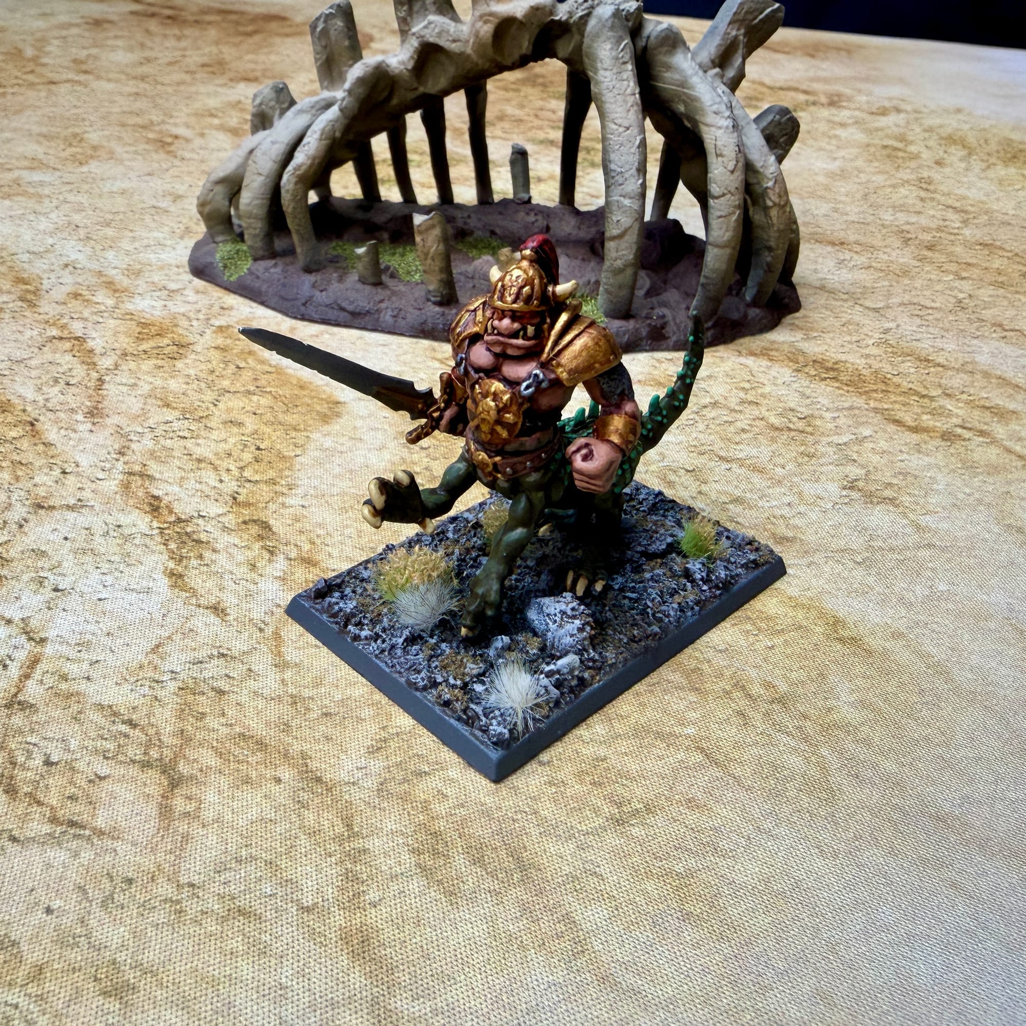 The World's Edge Mountains are a great natural redoubt between the forces of Chaos and the lands of men. Climbing past the first jagged row of peaks, Zubaz Chukai had one last ally to call upon for his warband: Grogg, a mighty dragon ogre with a dim and ancient memory of fighting alongside Zubaz's tribe of marauders in years past. Lured by the promise of flesh to eat and towns to plunder, he marched alongside the small force.